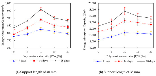 With a support length of 40 mm, Figure 4a and Table 4 show the increase in energy absorption over curing time and the polymer-to-water (P/W) ratio. After 7 days of curing, the energy absorption of the SBR latex-modified cement paste increased slightly by 2 to 6.2%. After 14 days, the increase in energy absorption was more significant, with a 12.4% rise at a 10% P/W ratio. After 28 days of curing, the crystalline structure of the cement paste was further optimized with the use of SBR latex, and the increase in energy absorption reached 14.9% at a 10% P/W ratio. Similar to the samples of cement paste cured at 7 days and 14 days, the energy absorption of the cement paste at 28 days tended to decrease when the P/W ratio exceeded 10%. This suggests that excessive use of SBR may negatively affect the gel structure and the mechanical performance of the material, as noted by Li et al. [9].