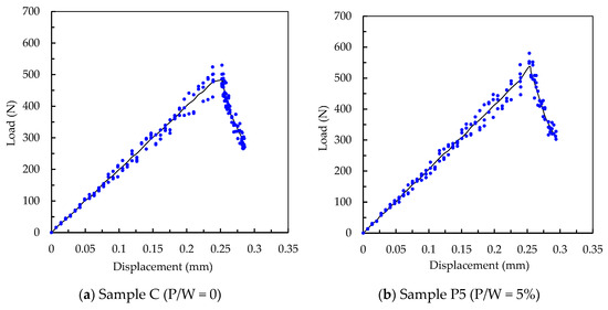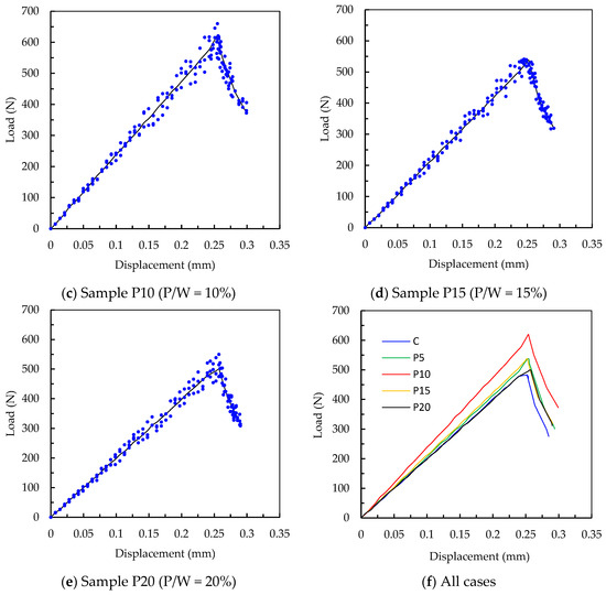 The three-point bending test was conducted on U-notched cement paste beams after 28 days of curing. The experimental data are presented through load–displacement curves in Figure 5, reflecting the variation in load corresponding to different polymer-to-water (P/W) ratios, ranging from 0% to 20%. Each graph illustrates the relationship between the applied load and displacement throughout the entire bending test.
