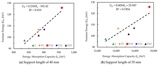 Correlation between fracture energy (GF) and Charpy impact energy (Is) of SBR latex-modified cement paste for two support lengths: (a) 40 mm and (b) 35 mm. The dashed lines represent linear regression fits of the data.