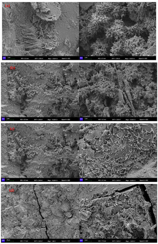 The influence of the burning temperature on the microstructure morphology of concrete hydration products. (a) Blank sample. (b) Burning at 400 °C. (c) Burning at 600 °C. (d) Burning at 800 °C.