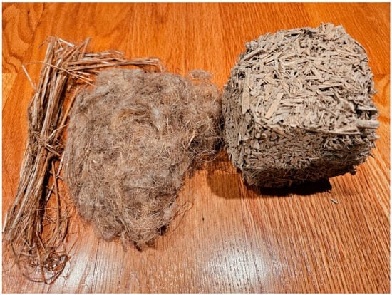 As made from the inner woody core of the hemp plant (Figure 1) mixed with a lime-based binder, hempcrete has gained attention in the construction industry for its sustainability, thermal properties, and environmental benefits [,]. Hempcrete is a natural, healthy, sustainable, and locally sourced mixture, offering low embodied energy compared to traditional construction materials. Its environmentally friendly characteristics have positioned it as a material that is potentially better than zero carbon, meaning it can offset more carbon than it emits throughout its lifecycle [,,,]. Its use can significantly reduce carbon emissions and waste production, making it an environmentally friendly choice []. Furthermore, hempcrete’s ability to improve indoor air quality and its potential for recyclability at the end of its useful life contribute to its status as a preferred material for sustainable construction. As awareness about hempcrete and its adoption in home building continues to grow, it represents a promising path toward achieving more sustainable and resilient built environments.