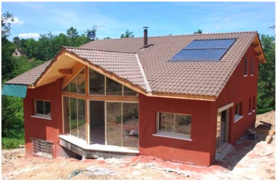 Two case studies [] in Northern and Southern Italy have evaluated the performance of hemp–lime buildings (Figure 8) through in situ monitoring, demonstrating that prefabricated hemp–lime blocks provide stable indoor temperatures and effective humidity regulation under both cold and warm Mediterranean climates. Despite limited or no HVAC use, internal conditions remained comfortable, with minimal fluctuation in temperature and relative humidity. The material’s high porosity and hygroscopicity allowed it to buffer external climate variations effectively. Numerical simulations using WUFI® (Pro 6.3) closely matched experimental results, validating the material’s passive insulation capabilities. These findings confirm hemp–lime’s suitability for sustainable construction, supporting its role in energy-efficient, low-impact building design.