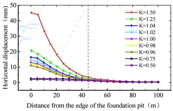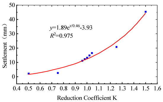 - The maximum settlement value increases with the increase in the reduction coefficient K, and the magnitude of the increase also increases with the increase of K. There is an exponential function relationship between the settlement value and the reduction coefficient K. This indicates that as the soil parameters decrease, the settlement will increase more and more significantly.