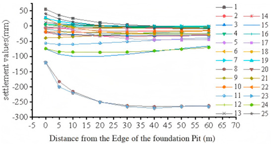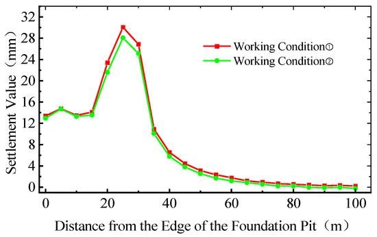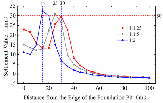 - The smaller the slope ratio, the greater the settlement value. This is because the smaller the slope ratio, the closer the building is to the edge of the foundation pit, and the greater the impact of foundation pit excavation. The maximum settlement value at the building location is greater than the settlement value at the edge of the foundation pit. When the distance between the building and the edge of the foundation pit reaches 60 m, the settlement impact is minimal.