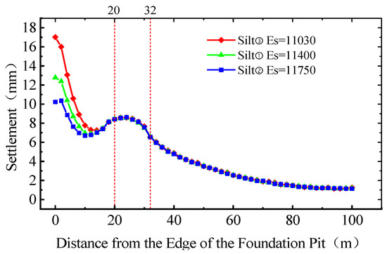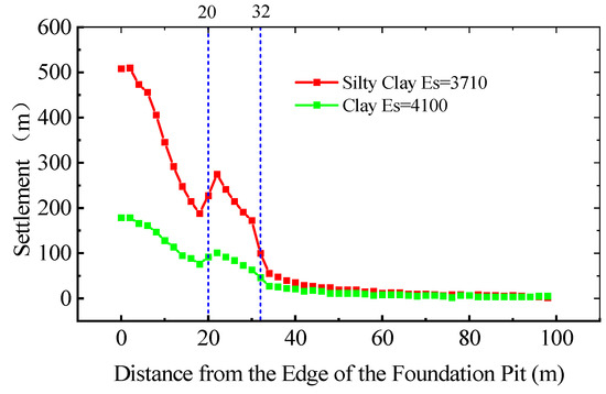 - For different soil and rock elastic moduli, the magnitude of the elastic modulus has a smaller impact on the settlement of distant adjacent buildings but a greater impact on the edge of the foundation pit. In particular, when excavating foundation pits in clay with low elastic modulus, slope support should be carried out according to the specifications.