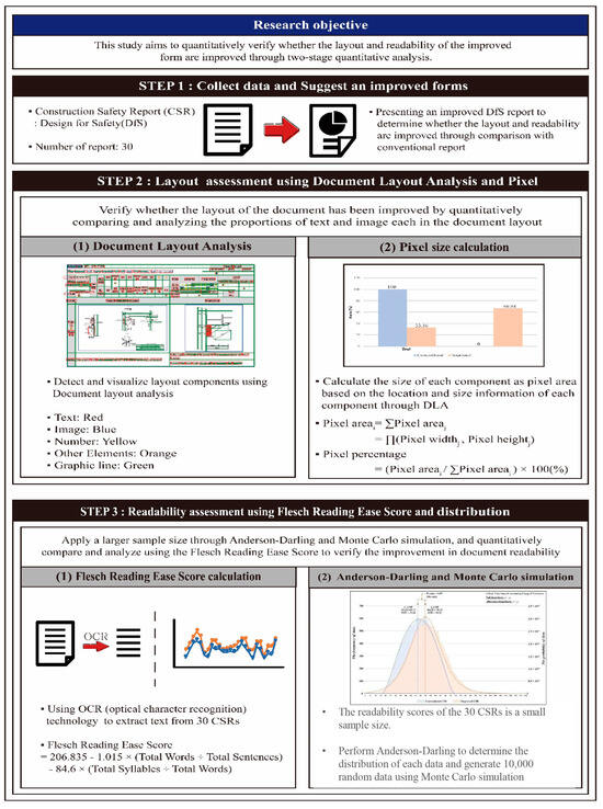First, this study collects 30 Design for Safety (DfS) reports. Then, it proposes 30 improved reports with added visual materials (images) to improve the conventional text-centered DfS. The effectiveness of these enhanced reports is then verified through the following steps. Second, the ratio of layout components (text and images) in the reports is calculated through document layout analysis and pixel analysis. This quantitatively verifies the improvement in the layout. Third, the Flesch Reading Ease formula, an indicator for evaluating the ease of reading text, is used to verify the improvement in readability. However, considering that the sample size of 30 reports may be insufficient to detect statistically significant differences, additional analyses are performed. In cases where the sample size is inadequate, Monte Carlo simulations are utilized to generate 10,000 random readability scores to derive more reliable results. This approach aims to estimate the characteristics of the population by generating a larger scale of random data based on the readability scores obtained from the limited dataset. This approach reduces statistical uncertainty due to limited data and contributes to a more reliable evaluation of the readability improvement of the improved CSR. The overall research framework is shown in Figure 1.