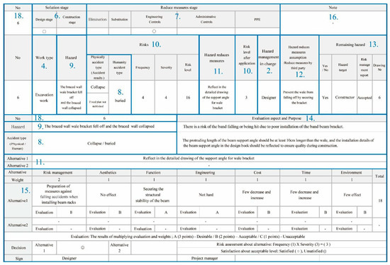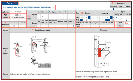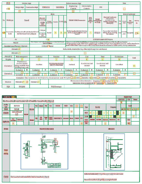 The CSR utilized in South Korea’s construction industry primarily encompasses DfS and the Safety and Health Design Record [40]. Although operated under different legislation, it is assessed that there is no significant difference in the contents of these two reports [41]. Therefore, for improving CSR in South Korea, if one format can be selected for proposing improvements, it is expected that the same approach can be applied to the other format, as well. Hence, in this study, the authors chose to focus on DfS reports, which are extensively researched globally. DfS was introduced in 2016 to enhance construction safety in South Korea [42]. It involves identifying potential hazards in the early design stages of construction projects and mitigating or eliminating them throughout the project phases to ensure safety during construction [43]. For effective analysis and results, 30 DfS reports issued by public agencies were collected as the conventional CSR. Afterwards, we proposed 30 improved CSRs with added visual data (pictures) to improve the conventional text-based CSR. The formats of the conventional CSR and improved CSR are shown in Figure 2 and Figure 3, respectively. The comparison of the components between the conventional and improved CSR formats is presented in Table 1. In this study, the comparison of the components between the two CSR formats yielded several differences between the conventional CSR and the improved CSR. In the conventional CSR, certain components were omitted, whereas the improved CSR has supplemented these by providing richer information through text and images. First, items, such as titles, facility types, final versions, and elements, not listed in the conventional CSR were added in text form in the improved CSR. Additionally, in the improved CSR, sections like hazard (accident causes) and hazard reduction measures (alternatives) are visually presented using images. However, some items present in the conventional CSR were omitted in the improved CSR, including reduced measures by third parties, remaining hazards, evaluation aspect and purpose, the evaluation table for alternatives, and notes. This comparison reveals that the transition from conventional CSR to improved CSR did not alter the existing common information; rather, parts of the text were simply replaced with images.