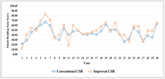 Overall, the authors observed that the readability scores of improved CSR are higher than those of conventional CSR, with the highest readability score of improved CSR being 82.94. The difference in scores between conventional and improved CSR is up to approximately 16.6, indicating a significant improvement in readability levels.