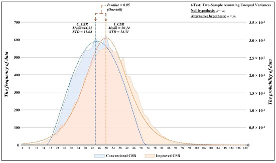 However, initial evaluations with a limited dataset present a challenge in fully reflecting the characteristics of the entire population. To address this, the characteristics of the population were more precisely analyzed using the A-D test and Monte Carlo simulation. After inferring the distribution through the A-D test, random readability score data for each report were generated through Monte Carlo simulation, producing 10,000 random readability scores for each, as shown in Figure 6. According to the analysis results in Table 9, the average readability scores of conventional CSR and improved CSR were 44.52 and 50.24, respectively, indicating that the readability of improved CSR was better than that of conventional CSR.
