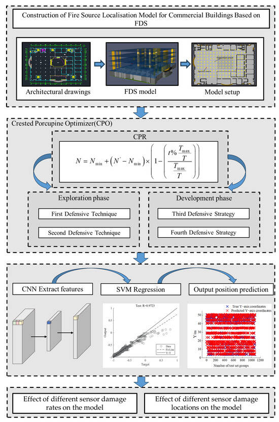 33]. Numerical simulations were validated by single-chamber fire experiments to demonstrate the realistic feasibility of numerical simulations. On this basis, a high realistic numerical simulation dataset was constructed. For model parameter selection, the CPO algorithm was introduced to achieve simultaneous optimisation of key parameters of the CNN-SVM using the dynamic neighbourhood search strategy of the porcupine defence mechanism to avoid local optima [
