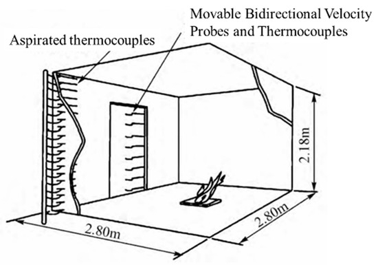 The power of the fire source was variously measured at 31.6 kW, 62.9 kW, 105.3 kW, and 158 kW. The size of the doorway opening varied from 0.24 to 0.99 m, and the height of the doorway was 1.83 m. Two-dimensional bi-directional velocity probes and bare-wire thermocouple arrays were arranged at the doorway to measure the flow velocity and temperature of the air at the doorway, with the vertical spacing of 0.114 m, where the first measurement point was 0.057 m from the floor. At the same time, to measure the temperature distribution at the corners of the room, a series of variations of the fire-source location and heat release rate were performed. To measure the temperature distribution at the corners of the room, a row of inhalation thermocouples was set up at the corners of the room, with thermocouple measurement points 0.305 m from each side wall, and a total of 19 thermocouples containing a thermocouple tree placed next to the front wall. The wall setup of the simulated room walls and ceiling was carried out based on the experimental description. The minimum grid size was 0.01 m, and the maximum was 0.05 m. The total grid size was 1.37 million, and the test room was connected to the outside space through a ‘door’ at an ambient temperature of 28 °C. The walls and ceiling were set up with ceramic fibre insulation boards to create quasi-steady state conditions. There were many kinds of working conditions because the fire-source location, fire-source heat release rate, and door opening size varied in the test. For this paper, we mainly simulated four working conditions in the test, and their parameter setting is shown in