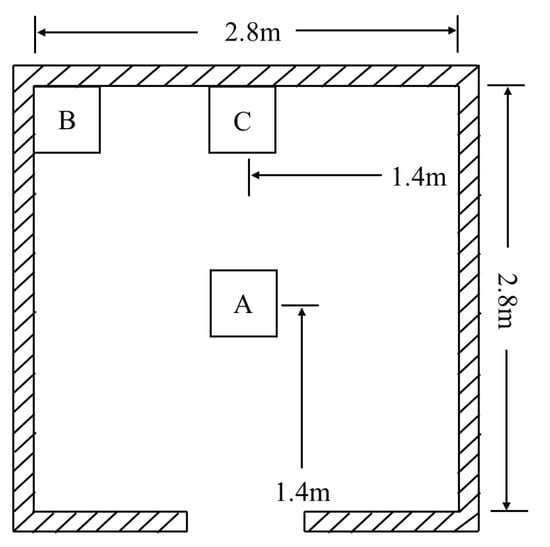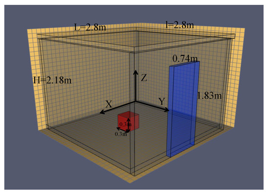 To ensure the realism of the training data, the simulation results of the numerical model were validated in this study in multiple steps. Steckler conducted a single-room fire test in 1982, in which comprehensive and detailed measurements of room temperature, doorway temperature, and doorway air flow rate were made for different fire-source locations and heat release rates, and the experimental room measured 2.8 m × 2.8 m × 2.13 m and contained a 1.83 × 0.74 m doorway as its vent. The room door dimensions, fire-source location, and heat release rate had a series of variations in the experiment, as shown in