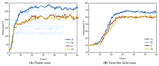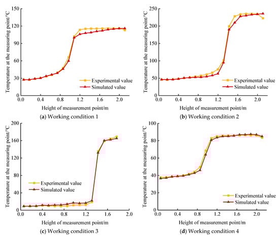 As the fire source will reach a steady state after ignition for a period of time, the temperature and velocity of the measurement point will also tend to level off after the fire source reaches a steady state; for example, in case 1, the temperature and velocity of the measurement point in the middle of the room door will reach the steady state after 50–80 s. To ensure that the simulation results are in the steady state, this paper selects the simulation results after 100 s and takes the average of the simulation results from 100–200 s as the final simulation result. The simulation results are compared and analysed with the test values. The comparison between the simulated and experimental values is shown in