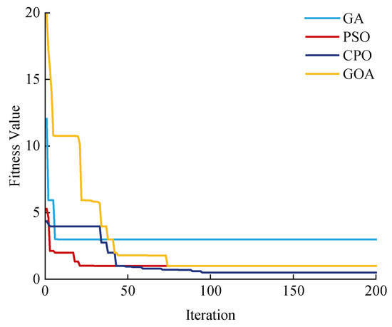 In order to verify the effectiveness of the optimisation of the CPO algorithm, we compared it with the PSO, GA, and GOA algorithms. In the CPO algorithm, the number of population
