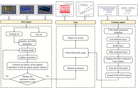The hybrid model CPO-CNN-SVM’s prediction process is divided into three modules: data input, training input, and result output, as shown in