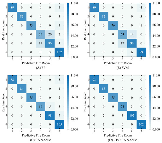 Figure 17A–D show the BP, SVM, CNN-SVM, and CPO-CNN-SVM models, respectively. The vertical axis indicates the actual fire-source room, the horizontal axis indicates the predicted fire-source room, and the diagonal line indicates the number of correctly predicted samples; the closer to the complete diagonal distribution, the higher the model localisation accuracy. As a whole, all models achieved high accuracy in most rooms, especially rooms 1, 2, and 6, but there was confusion in the identification of rooms 4 and 5, with room 4 predicted as room 5 in all model tests; SVM and BP performed especially poorly. By analysing the experimental results and tracing the causes, it was found that this phenomenon is due to the fact that the fire-source occurred in two adjacent rooms with similar size and structure, and as the heat flow of the fire source propagated along the corridor, it was very likely to affect the neighbouring rooms, making the temperature field in the region more similar, causing difficulties and model confusion. The CPO-CNN-SVM model performed best and was stable in edge room localisation, with a prediction accuracy of 5 out of 6 rooms exceeding 90%, of which rooms 4, 5 and 6 were the most accurate in terms of discrimination, and with an overall accuracy as high as 97.61%, which maximally overcame the problem of confusing the identification of neighbouring fire-source rooms.