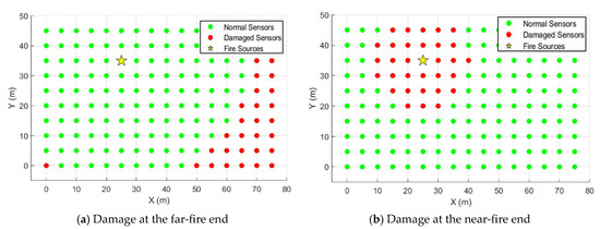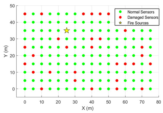 Figure 18 shows an example of a 20% damage rate for a sensor with an ignition source at (25, 35). Seven different sensor damage scenarios, 6 ignition source locations, and a total of 42 working conditions. Experiments were carried out for each fire location with 7 different sensor damage rates to verify the validity of the model.