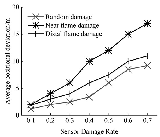 Figure 20 shows the average deviation of model position prediction with damage rate for 42 working conditions involving random sensor damage and 84 working conditions with different sensor damage locations and damage rates. It can be seen that the accuracy of prediction is closely related to the location of the sensor damage. The data of the near-fire source changes drastically and critically. All the sensor damage here has the greatest impact on the prediction results, with the error in the critical area accumulating, and the average position deviation reaching 17 m. While the temperature rise at the far-fire-source end is gentle, the temperature difference between the target sensor and the surrounding sensors is not large, and the model can compensate for the damage by using data from other sensors with better learning, so the damage impact is smaller. Whereas random damage generally does not result in an extreme situation of a large area of missing data or an anomalous region, the model can fully learn the temperature data of the neighbouring points for prediction, and the position prediction deviation is minimal.