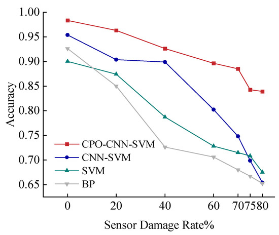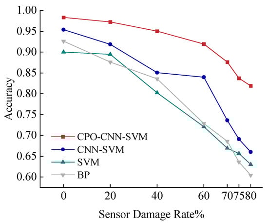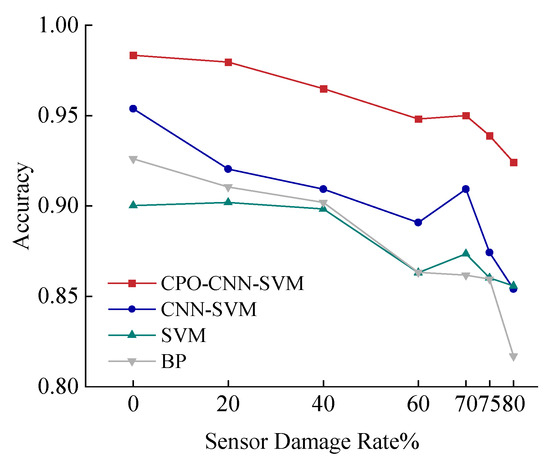 It can be seen that, compared with the sensor interval damage case, these two concentrated damage cases have a greater impact on the models, and the prediction accuracies of all the models show decreasing trends of different degrees. However, the CPO-CNN-SVM model still shows strong anti-interference ability in the face of these two extreme damage cases. When the damage rate reaches 80%, the accuracy of the model can still be maintained above 80%. If the prediction accuracy of the CPO-CNN-SVM model is kept above 90%, the damage rate should be controlled within 40% when the sensors are concentrated at the same end. When the sensors are concentrated at both ends of the channel, the damage rate should be controlled at 60%. When the damage rate is 70%, the prediction accuracies of the CPO-CNN-SVM model in these two cases are 88.5% and 87.61%, respectively, which are significantly better than other models. In contrast, when the damage rate exceeds 60%, the accuracy of CNN-SVM begins to decline significantly. When the damage rate exceeds 20%, the accuracies of SVM and BP decline significantly. In summary, the concentrated damage of edge sensors to the model can cause a significant decline in model prediction accuracy. Therefore, the regular inspection of sensors in buildings should be strengthened to ensure the reliability of the system and prevent the adverse effects of high-concentration damage rates.