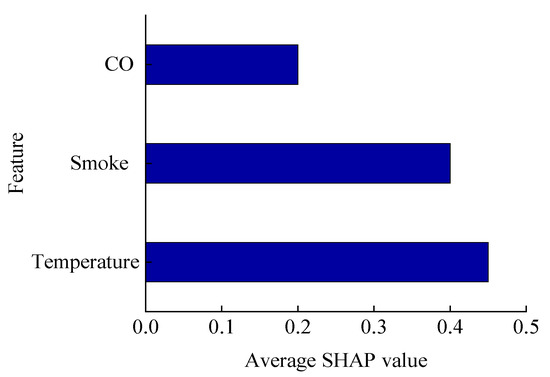 Figure 24 shows the analysis of SHAP values for the model input variables. The average SHAP values for temperature and smoke are 0.45 and 0.4, respectively, and CO is 0.2. It can be seen that temperature contributes the most to location prediction, with smoke and CO decreasing gradually.