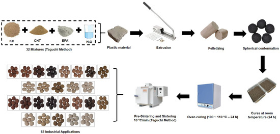 Figure 1 presents a comprehensive overview of the entire experimental program, encompassing the selection of raw materials for the production of lightweight aggregates (LWAs) and the various sintering conditions explored (using the Taguchi method), visually represented through different color schemes. The study initially considered 32 potential mixtures [8]; however, those containing 40%, 60%, and 80% waste content experienced complete melting at the sintering temperature of 1180 °C (mixtures 7, 10, 13, 23, 26, and 29). This prevented their characterization and ruled out their suitability for industrial application. As a result, only 26 viable mixtures were successfully analyzed and are presented in this manuscript.