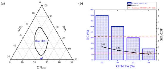 (a) Chemical composition of ternary mixtures in the Riley ternary diagram [10]; and (b) Values of the SiO2/ƩOF ratio.