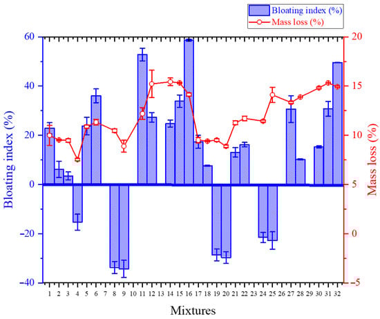 Figure 3 shows the behavior of ternary mixtures, highlighting the variations in the expansion index and mass loss of LWAs. The analysis in Figure 3 reveals that the mixtures present an expansion ranging from low to moderately high (5–60%), accompanied by a low mass loss (7.5–15%). According to the literature [4,8,29,34], this low expansion does not compromise the production of LWAs.