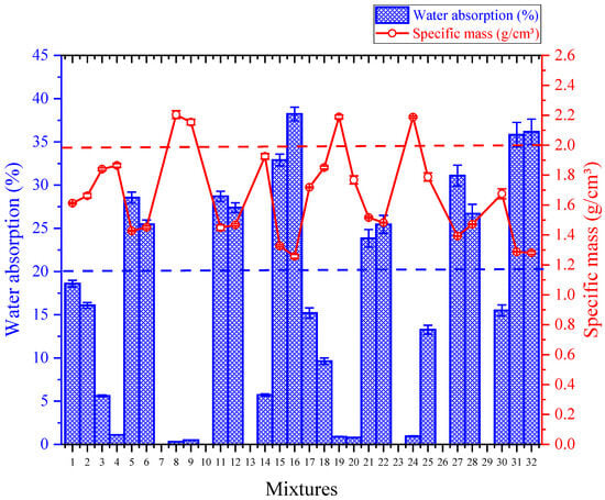 Figure 4 shows the behavior of the ternary mixtures regarding specific mass and water absorption. Most of the mixtures presented water absorption below 20%, a value considered adequate for application in high-strength lightweight concrete, as described in commercial LWA catalogs [41,42,43]. Furthermore, most of the mixtures presented specific mass below 1.90 g/cm3, meeting the classification criteria for LWA as established by the standards [2].