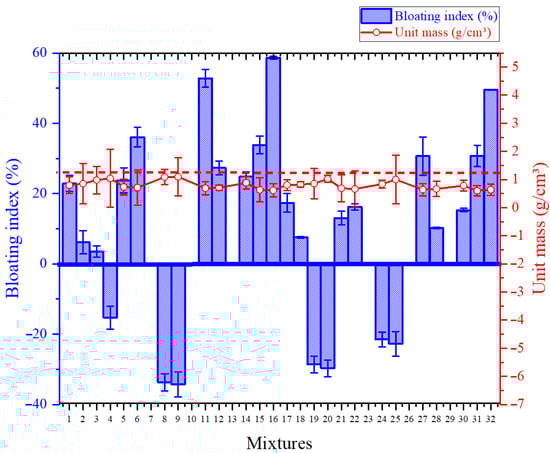 As the residue content increases above 40%, unit masses decrease, especially at temperatures below 1145 °C. In the composition with 80% residue (mixture 32), the unit mass drops to 0.60 g/cm3. On the other hand, by reducing the residue content to 20% and maintaining the temperature at 1075 °C (mixture 1), the unit mass increases to 0.80 g/cm3. Previous research [10,33,34,40,56] found that, at high temperatures, densification of the clay matrix occurs, resulting in a reduction in porosity and high unit masses. With increasing waste content, this densification is increasingly affected by the residues [3,40,41]. Upon decomposition, calcium carbonate and calcium sulfate, present in the EFA residue, generate reactions that result in more significant expansion and pore formation, which significantly reduces the unit masses, corroborating the findings of [8,57,58].