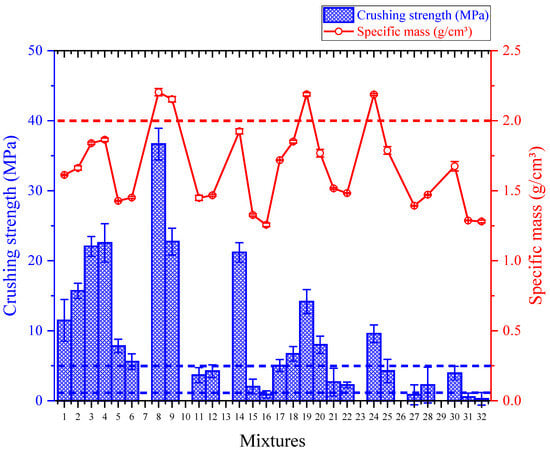 Figure 6 presents the ternary mixtures in terms of crushing resistance and specific mass. It is observed that crushing resistances are directly proportional to masses. In general, it was found that most mixtures meet the mechanical strength criteria established for commercial LWAs, with values above 1.00 MPa [41,42,43].