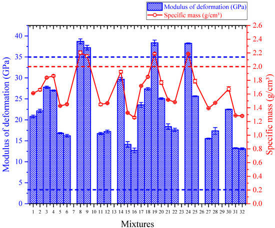 The deformation modulus and specific mass are presented in Figure 7. The results indicate that the deformation modulus is proportional to the specific mass of the mixtures. Almost all the mixtures exhibited a deformation modulus higher than 15 GPa, exceeding the minimum limit of 3 GPa required for commercial LWAs. In some cases, such as mixtures 8, 9, 19, 24, and 25, the values exceeded 35 GPa.