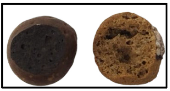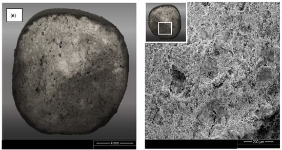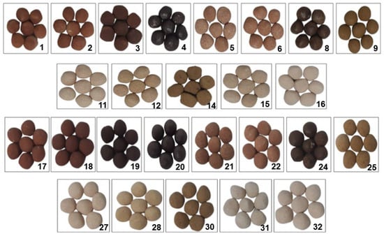 Figure 8 shows the 32 LWAs produced with CHT and EFA residues in particle sizes of 6.25 mm (mixtures 1–16) and 12.5 mm (mixtures 17–32), as described in the experimental program (Table 2). The colors range from light reddish-brown to white, including cream, black, and golden yellow shades. Mixtures 1 to 3 stand out, presenting a color identical to the expanded clay from Cinexpan, São Paulo/PB, Brazil [41,42].