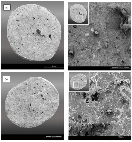 Figure 9 shows the microstructure of LWAs produced with different waste contents (20%, 40%, and 80%) and sintered at 1075 °C and 1145 °C. It highlights the influence of composition and sintering temperature on the internal structure of the aggregates. Mixtures 1, 3, 8, 14, and 16 were selected for this analysis, based on the experimental program (Table 2). These mixtures were chosen because, according to the statistical modeling, the sintering temperature and waste content were identified as the most significant factors influencing the properties of the LWAs. Selected samples were oven-dried at 110 °C for 24 h, mounted on aluminum stubs using carbon adhesive tape, and coated with a thin layer of gold via sputtering. Scanning electron microscopy (SEM) images were acquired at an accelerating voltage of 20 kV [8].