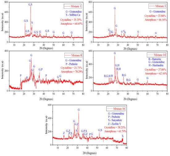 Mineralogical analysis revealed the presence of gismondine in all the sintered mixtures, as shown in Figure 10. This zeolitic mineral, composed of hydrated calcium aluminosilicates, has a porous structure suitable for ion exchange, selective adsorption, and catalysis, with potential application in several industrial processes.