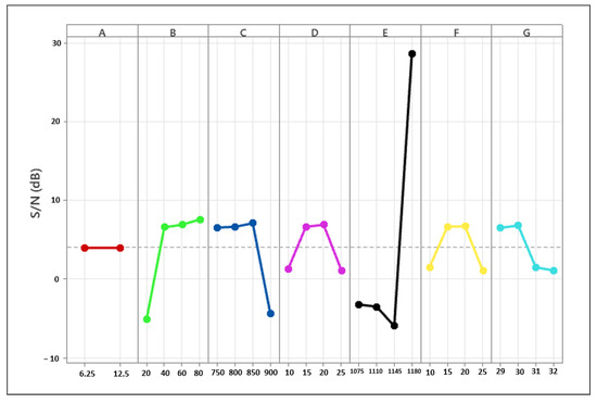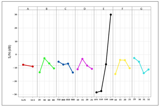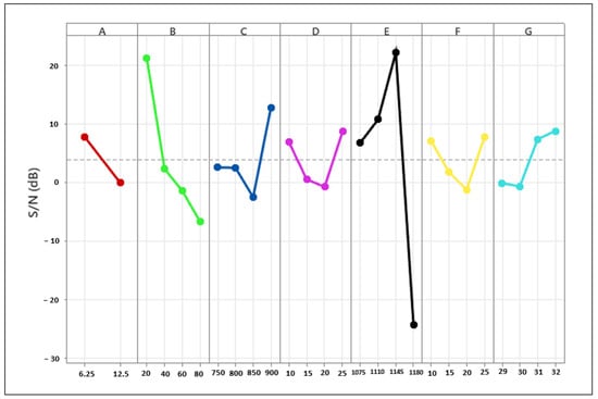 Furthermore, a statistical analysis was conducted following the methodology described in [8], employing the signal-to-noise (S/N) ratio to identify the key parameters influencing the evaluated response and ANOVA to validate this relationship. Subsequently, response surface plots were adjusted based on the two variables with the greatest influence on the response.