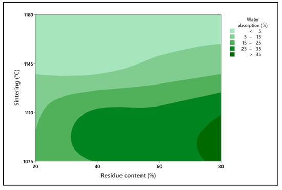 Intermediate conditions, such as moderate residue contents (40–60%) and sintering temperatures around 1110–1145 °C, result in transitional behavior, where partial densification occurs. In these regions, specific mass values range between 1.50 and 2.00 g/cm3, water absorption typically varies between 15% and 25%, and compressive strength remains between 15 and 25 MPa. These results emphasize the combined influence of both processing parameters. The residue content likely influences the formation of low-melting phases or inhibits sintering by introducing refractory components, while temperature directly affects the extent of liquid-phase sintering and the overall microstructural development.