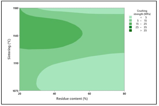 On the other hand, at higher sintering temperatures (1145–1180 °C) and lower residue contents (20–40%), the sintering process is significantly more effective, leading to enhanced densification. Under these conditions, the specific mass surpasses 2.00 g/cm3, water absorption drops below 15%, and crushing strength values exceed 35 MPa. This behavior can be attributed to improved diffusion and viscous flow during sintering, which reduce the volume of open pores and promote the formation of a more cohesive and compact microstructure.