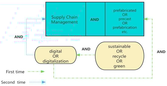 As shown in Figure 3 below, these keywords can be divided into two main categories, distinguished by blue and yellow colors. Among them, terms such as “supply chain management” and “prefabricated” (including “precast” or “prefabrication” or “industrialization” or “offsite” or “modular”) belong to the domain-specific nouns of this study, namely, supply-chain-management- and prefabricated-construction-related terminology. On the other hand, terms such as “digital” or “digitalization”, and “sustainable” or “recycle” or “green” serve as modifiers with specific attributes. Since a total of two rounds of searches were conducted, the use of keywords for this set of keywords also needs to be discussed separately as Figure 3 shown below. Based on the above screening principles, in the first round of searches, in order to study studies related to the application of digital technology in PCSCM, the logical operator “AND” was used to connect terms related to digital to the first set of keywords, while “OR” was used to connect expressions similar to “digital” to ensure the search’s completeness; a total of 147 relevant publications were obtained after screening. And “OR” was used to connect between terms similar to digitalization to ensure the completeness of the search. In the second search, as the research was related to the application of digitalization to achieve sustainability in the field of PCSCM, thematic modifiers related to sustainability were added and connected using “AND”, and, similarly, words related to “sustainable” could be connected using “OR”, leaving only 27 relevant publications after screening.