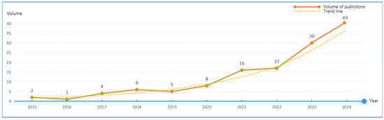 As demonstrated in Figure 4, the number of publications has been increasing exponentially, reaching a peak of 40 articles published for the first time in 2023, with a total of more than 129 publications. Consequently, the period of publications studied can be divided into two phases: slow growth and rapid development. The rapid growth phase is characterized by two plateaus. A comprehensive review of the literature reveals that PCSCM commenced development in relatively early years. However, the present study focuses on the subject of digital PCSCM, which was first published in 2015 and has gradually attracted significant attention up to the present decade. The advent of the digital age has facilitated the digitization of PCs, and the concepts of greenness and sustainability have become a research hotspot as environmental issues become more prominent in the current global situation [15].