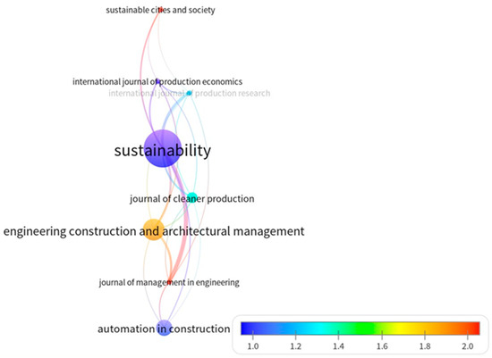 The following Figure 5 and Table 1 show the eight types of journals with the largest number of publications in the research field of this article. To a certain extent, these top eight journals can be regarded as the most recognized journals in the field of PCSCM. This figure is generated by VOSviewer based on the number of articles and with the total link strength as the construction index of the connection network. The color of the lines is represented by the legend at the bottom right to indicate the degree of association. It can be clearly seen from the figure that “Sustainability”, “Journal of Management in Engineering”, “Engineering Construction and Architectural Management”, and “Journal of Cleaner Production” are the four journals with the largest number of publications. At the same time, the total citation times and total link strength of the top three articles in terms of the total number of article publications also rank among the top three. To a certain extent, these two indicators both reflect the influence of such journals in the relevant research field and the guarantee of the quality of publications. The difference is that the total citation times is a more intuitive count value to reflect the content quality of the article and the affirmation of its contribution in academia, while the total link strength emphasizes more on the relevance and dissemination potential of the article in the entire information network. Articles with a high link strength may be the hubs of information dissemination, being able to establish connections with many other articles and having strong information diffusion capabilities.
