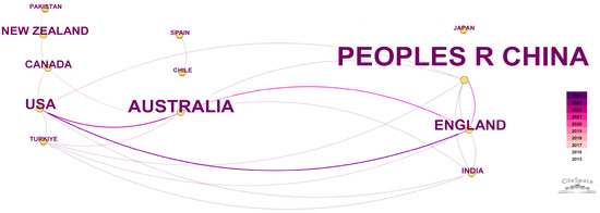 This centrality parameter reflects the central role of the article (or author, journal, etc.) in the process of knowledge dissemination. An article with high centrality is like a transport center that plays an important connecting role in the flow and dissemination of knowledge. A highly centered article may be simultaneously cited by researchers from different disciplinary backgrounds, and the theories, methods, or perspectives it contains become a bridge for knowledge exchange between different disciplines. The other active countries are the UK, the USA, and New Zealand, in that order. Compared to the above, India has less interaction with other countries.