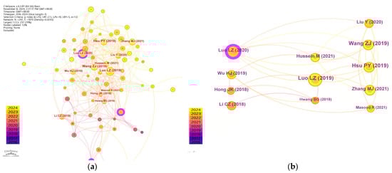 Table 3 presents a quantitative analysis of author citations, including citation times, centrality, year, author name, and article title. It can be seen from the table that the article titled “Stakeholder-Associated SC Risks and Their Interactions in a PC Project in Hong Kong” by Luo, Lizi [22] has the highest citation times, and the corresponding circle in Figure 7b is also the largest. Zhong, Ray Y [21], Huang, George Q [23], and Xu, Gangyan [21] entered the field of PCSCM earlier and jointly completed “Towards Physical Internet-enabled Prefabricated Housing Construction in Hong Kong”, which studied the PC structure in Hong Kong and integrated digital technologies such as the Internet of Things and the Internet to achieve the sustainable, green, and efficient development of buildings. Zhai, Yue [24] has achieved high-level results in solving the problem of production delivery cycle hedging in the SCM of PC and reducing the delayed delivery caused by the uncertainty of prefabricated component production. In addition, Li, CZ [25] and Du, Qiang [26] also have a great influence on the research of the green sustainability of PC.
