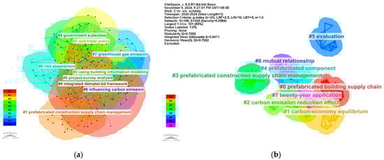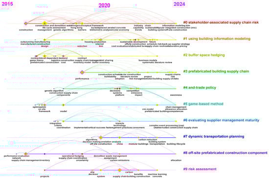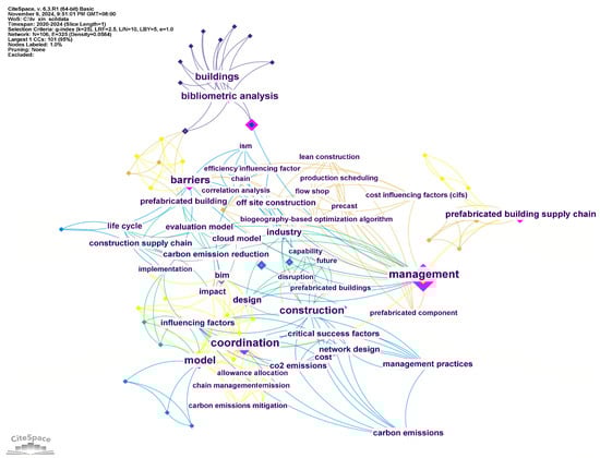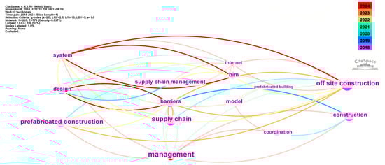 The visual analysis of keywords has been demonstrated to reflect the research topics of the literature and the research hot points in the field, thus facilitating a better understanding of the research directions in this area [8]. In this article, the keyword analysis of Citespace is divided into three parts, a keyword atlas analysis, keyword mutation analysis, and keyword clustering analysis, and timeline collinearity analysis. As illustrated in Figure 8, the analysis uncovers the research themes that have garnered significant attention in the literature concerning digital transformation and sustainability within the domain of PCSCM. The figure reveals various distribution clusters, highlighting the prevalence of digital technologies such as BIM and models quantifying carbon emissions and energy consumption, which are pertinent to sustainability.