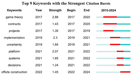 The following Figure 10 presents a keyword burst analysis. By adjusting the keyword threshold, the top nine keywords with the highest burst numbers are retained. This figure can clearly reflect specific research hot points during a certain period and their duration. It can be observed that, with 2019 as the demarcation year, the hot points from 2017 to 2019 were concentrated on “game theory”, “contracts”, and “implementation”, while, from 2019 to 2024, they were “decision”, “system”, “offsite construction”, etc.