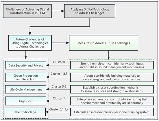 As the seven clusters of data for Figure 11b in the cluster analysis above are based on the themes of the literature in Section 4.2.2 above, measures to address the future application of digital technologies in the construction industry for the sustainable development of PCSCM need to be presented in relation to the themes in the cluster analysis. Figure 13 below clearly illustrates the logical relationship between the challenges of applying digital technology to PCSCM in the future and the corresponding measures, each of which is explained in detail below: