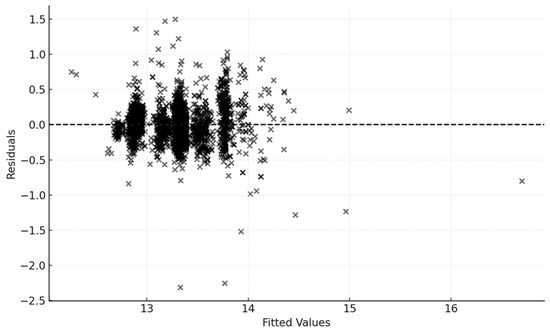 The hedonic pricing model effectively quantified these effects, revealing distinct spatial and temporal patterns. Proximity to the Queen’s Wharf Brisbane (QWB) project exhibited a significant negative coefficient (−0.0374), indicating a premium for properties closer to this mixed-use development. This coefficient implies that a decrease in each unit distance to the QWB is aligned with an approximately 3.17% increase in residential property prices, confirming the hypothesis of intangible value transfer from urban megaprojects. Conversely, proximity to Brisbane Live showed a smaller, yet positive and statistically significant effect (0.0309), suggesting a slightly nuanced market reaction, potentially due to project-specific attributes such as expected entertainment-driven disturbances or differential consumer perceptions regarding residential desirability in this precinct. In contrast, the Cross River Rail proximity coefficient (−0.0118) was not statistically significant, reflecting more subdued impacts from transportation infrastructure alone. Structural property attributes consistently demonstrated strong statistical significance. Specifically, each additional bedroom added approximately 26.49% to property values, and car parks contributed around 19.54%, while additional bathrooms surprisingly showed a positive coefficient (17.16%), likely due to the underlying market segmentation or preferences in apartment configurations. Year-fixed effects revealed temporal fluctuations clearly correlated with project development phases. Notably, relative to 2016, property values faced declines during intensive construction years, with the largest negative impact occurring in 2019 (−8.48%), coinciding with peak excavation and construction activities. Property values generally recovered slightly in subsequent years, reflecting market adaptation and growing recognition of long-term project benefits. Model diagnostics confirmed robustness, with heteroskedasticity adequately addressed via robust standard errors. Variance Inflation Factors (VIFs) were calculated to assess multicollinearity among regressors. The absence of a significant autocorrelation and confirmation of the correct functional form (Ramsey RESET test) further validated the model’s reliability. Overall, the results provide clear empirical evidence that proximity to urban megaprojects significantly enhances residential property values, albeit tempered by short-term disruptions during major construction periods. These findings offer critical quantitative insights for stakeholders involved in property investment, urban planning, and policy formulation. Figure 2 shows the residuals from the model against fitted values, showing a dispersional cloud around zero. The distribution appears homoscedastic, with residuals showing relatively constant variance across the range of fitted values. No funnel-shaped patterns are observed, supporting the assumption of homoscedasticity. The centred dispersion around the zero line indicates no major functional form misspecification, confirming heteroskedasticity control and validating the model specification. These visual diagnostics support the results from the Breusch–Pagan and RESET tests, confirming the adequacy of the model specification.