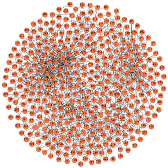This study treats industries as nodes and uses intermediate flows from the 2007, 2012, and 2017 detailed benchmark commodity-by-commodity total demand input–output tables as the metric for industrial linkages to establish an association matrix. Given many industry nodes, directly constructing an industrial network with edges representing inter-industry connections would result in excessively dense edges, hindering network observation and analysis. Therefore, we establish the mean value of inter-industry input shares as a threshold: intermediate flows above this mean are assigned a value of 1. In contrast, those below are assigned 0, constructing a binary (0–1) industrial association matrix. When building the U.S. intra-regional industrial network , an element value of 1 in the matrix indicates an input–output linkage between the corresponding row and column industries, forming an edge; otherwise, no edge is formed. Figure 2 illustrates the 2017 U.S. industrial network.