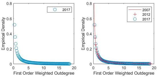 The findings of Acemoglu et al. (2012) [24] and Carvalho et al. (2019) [37] suggest that if the industrial network of an economic system has a symmetric supply structure or demand structure, fluctuations in the output of a particular industry or industries are averaged out by the majority of the sectors in that economic system, and hence total output fluctuations are negligible. On the contrary, asymmetries in the industrial network infrastructure provide a potential mechanism for the propagation and diffusion of sectoral shocks or output fluctuations in the economic system, leading to aggregate output fluctuations. If the first-order weighted out-degree follows a normal distribution, indicating that most industries’ first-tier supply connections cluster around the mean, the first-order supply structure of the industrial network is deemed symmetric, thus obviating the need for second-order structural analysis. Conversely, if adheres to a power-law distribution, this reveals the existence of a few dominant direct suppliers (first-tier supply hubs) in the economic system, signifying an asymmetric first-order supply structure. In such cases, extending the analysis to the distribution of , if it also exhibits power-law characteristics, would confirm the asymmetric nature of the second-order indirect supply structure in the industrial network.