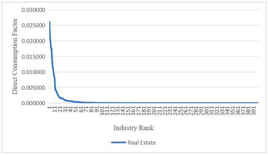 First, the direct consumption coefficients between real estate and other industries are calculated. The estimated direct consumption coefficients are ranked in order of magnitude. The first-order linked industries with a high correlation with the real estate industry are filtered according to the empirical values (e.g., industries when the cumulative proportion reaches 95%). Second, the full consumption coefficient includes both direct and full indirect consumption, and second-order related industries can be identified by comparing the difference between the full consumption coefficient and the direct consumption coefficient. Specifically, for a given first-order linked industry, if its full consumption coefficient is much larger than the direct consumption coefficient and this additional consumption is mainly provided by other (i.e., other than that first-order linked industry) industries, these industries can be considered as second-order linked industries of the real estate industry [38]. According to the size ranking of the difference between the coefficient of complete consumption and the coefficient of direct consumption, the second-order linked industries with a high degree of association with the real estate industry are screened out. Finally, the characteristics of the real estate industry in the supply and demand structure of the industrial network are analyzed.