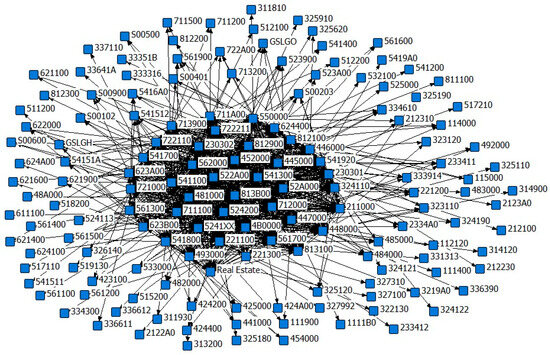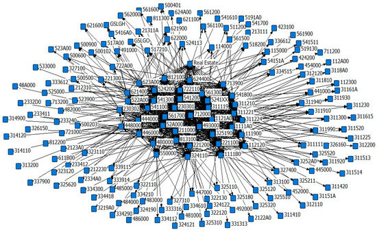 Given the high granularity of the commodity-by-commodity input–output (IO) tables utilized in this study, a cumulative proportion threshold of 98% was applied to filter industries for network visualization, ensuring a clear representation of the real estate industry’s interdependencies. This threshold identified first-order and second-order linked industries of the real estate industry and strongly associated industries of its first-order partners. Since the first-order and second-order linked industries of the real estate industry and the strongly linked industries of the first-order linked industries may overlap, the final filtered node sets comprised 120 nodes in the 2007 U.S. real estate network, 180 nodes in 2012, and 158 nodes in 2017.